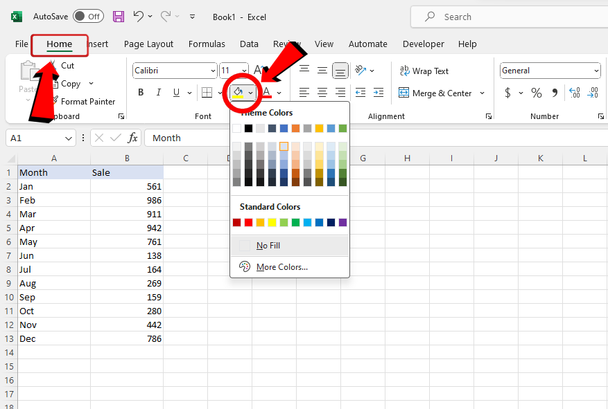 Krok 1: Aby wyróżnić komórki nagłówka i nadać im wizualnego znaczenia, przejdź do karty „Narzędzia główne”, a następnie w sekcji „Czcionka” wybierz opcję „Kolor wypełnienia”, aby zmienić kolor tła komórek.